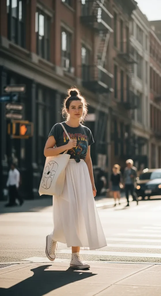 A vintage-style graphic tee tucked into a white maxi skirt creates that perfect blend of casual and cool. The relaxed top tones down the skirt’s femininity, making the outfit feel playful and approachable.