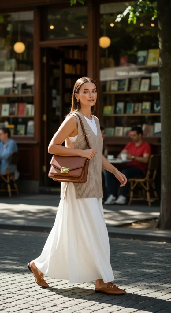 A lightweight knit vest layered over a simple tank with a white maxi skirt creates a modern layered summer look. The mix of textures feels thoughtful but still relaxed.