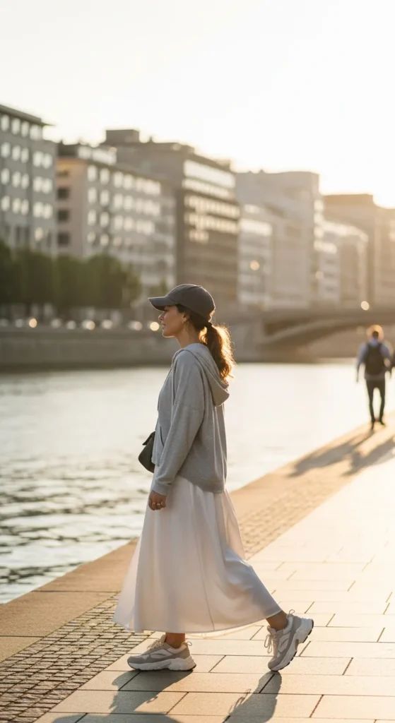 Stylist Suggestion: Choose chunky sneakers and a baseball cap. The sporty elements contrast beautifully with the soft skirt and give the outfit an effortless street-style edge.