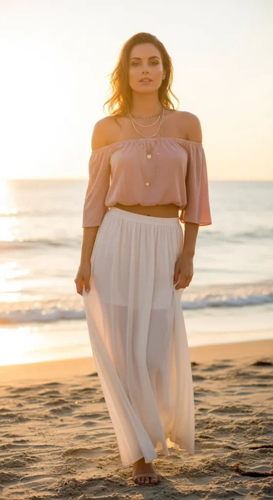 An off-shoulder top paired with a white maxi skirt highlights the shoulders and creates a soft, summery silhouette that feels feminine and effortless.