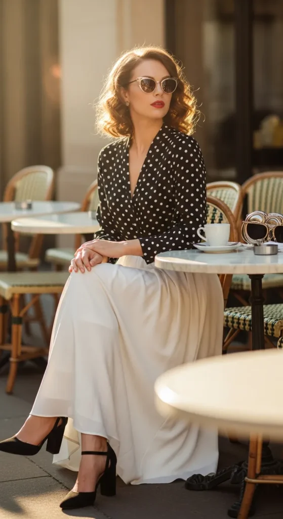 A playful polka dot blouse with a white maxi skirt brings vintage charm into a fresh summer outfit that feels lighthearted and stylish.