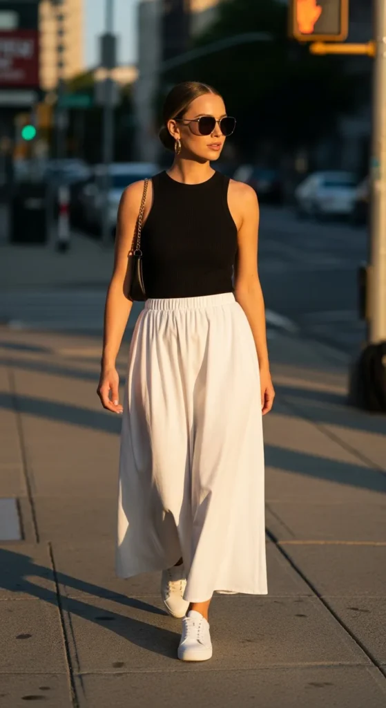 A fitted ribbed tank paired with a breezy white maxi skirt creates a beautiful contrast between structure and flow. It’s a simple outfit that feels modern and comfortable, perfect for everyday errands or relaxed summer afternoons.