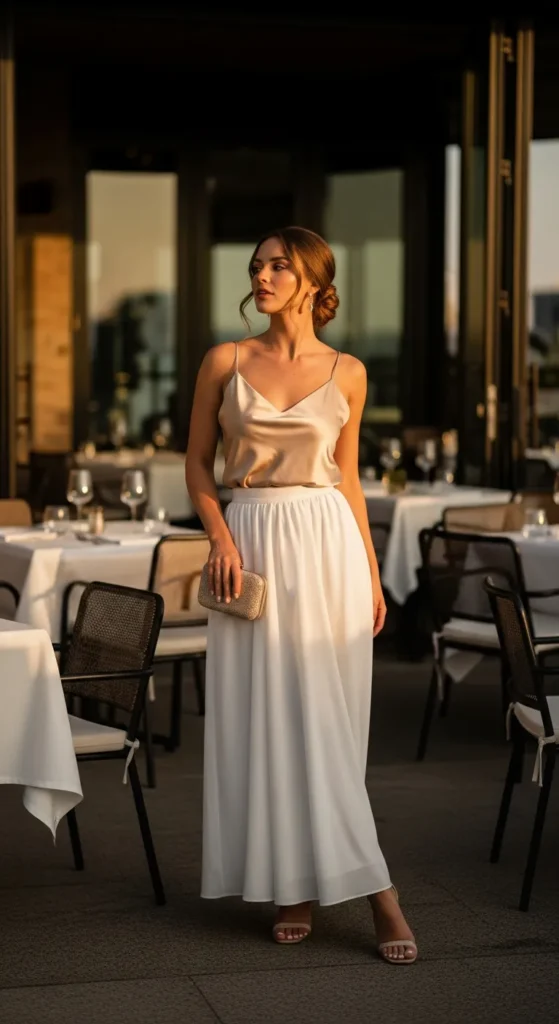 A silky satin camisole tucked into a white maxi skirt creates a polished yet effortless outfit that works beautifully for summer evenings or dinner plans.