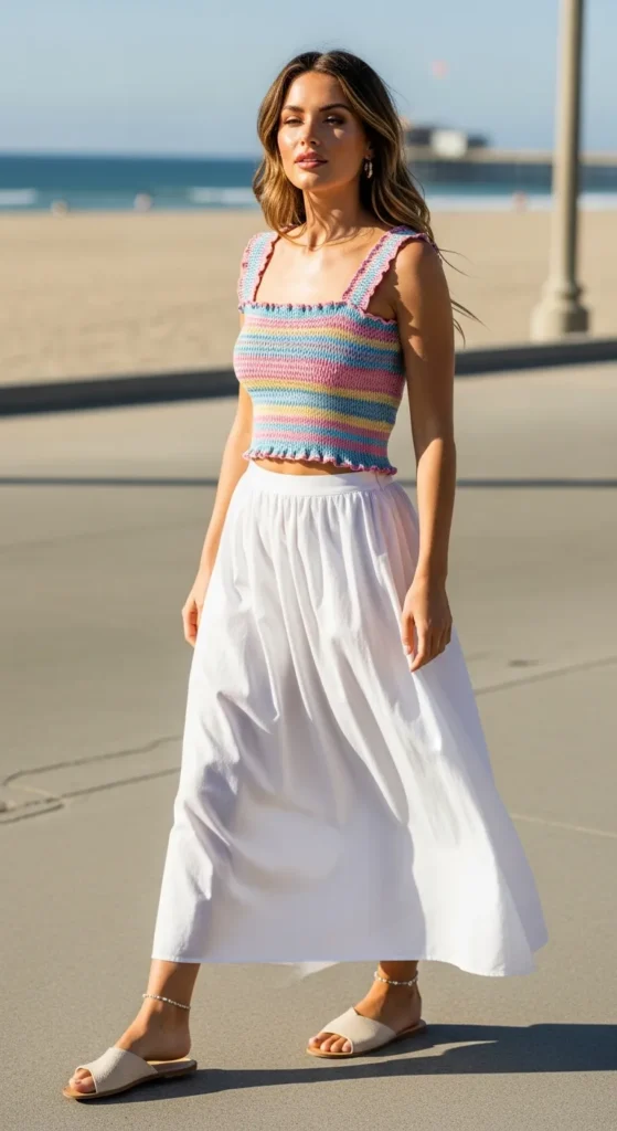 A smocked crop top with a white maxi skirt creates a breezy summer outfit that feels playful and youthful while still looking balanced.