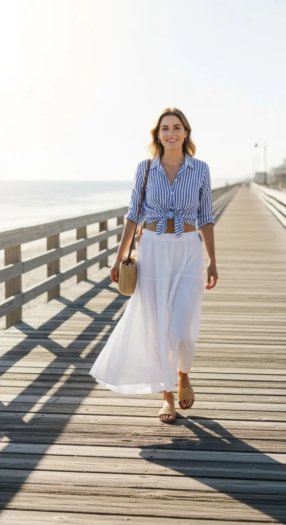 A breezy striped button-up shirt worn slightly tucked into a white maxi skirt brings coastal energy to your summer wardrobe. The stripes add visual interest while keeping the outfit relaxed and effortless.