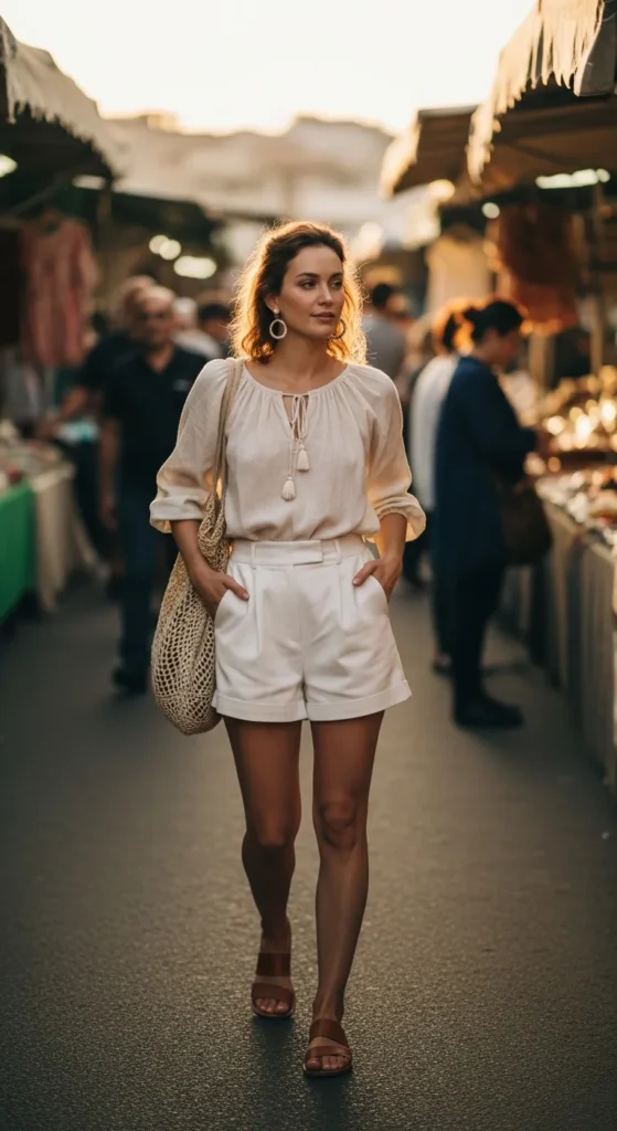 A soft peasant-style blouse paired with white shorts feels feminine and relaxed. It’s perfect for warm days when you want flow, comfort, and subtle detail all at once.