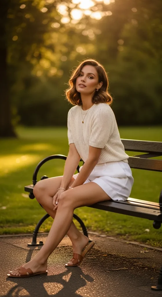 A short-sleeve summer sweater with white shorts blends softness and structure beautifully. It’s cozy enough to feel styled but light enough for warm weather.
