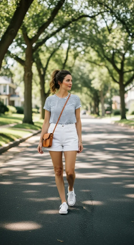 A striped tee with white shorts feels cheerful and effortless, perfect for sunny days when you want something familiar but fresh. It’s simple styling that always works.