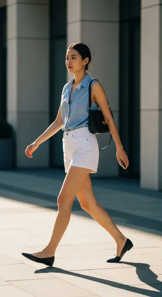 A sleeveless button-up top with white shorts feels fresh and structured. It’s great for warm days when you want something polished without layering.