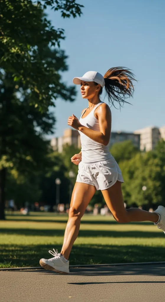 A sporty tank with white shorts creates an active, confident summer look that feels fresh and energetic. It’s ideal for errands, travel days, or casual hangouts.