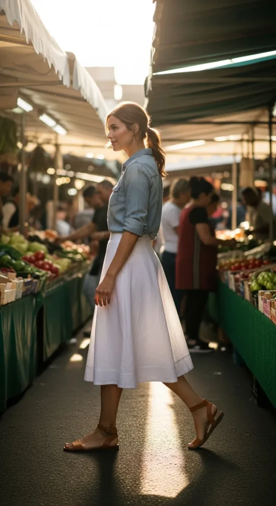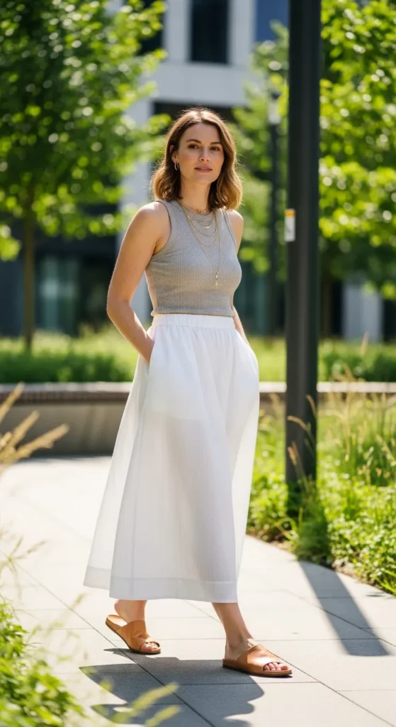 A flowy white skirt and linen tank is the definition of warm-weather ease. Breathable fabrics and soft movement make this outfit feel light, feminine, and perfect for slow sunny days.