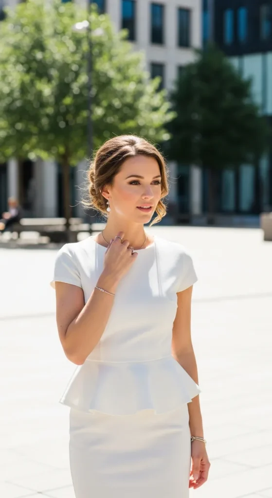 A peplum top paired with a white skirt feels cheerful and flattering. The gentle flare adds movement, making the outfit feel joyful and perfect for sunny strolls.