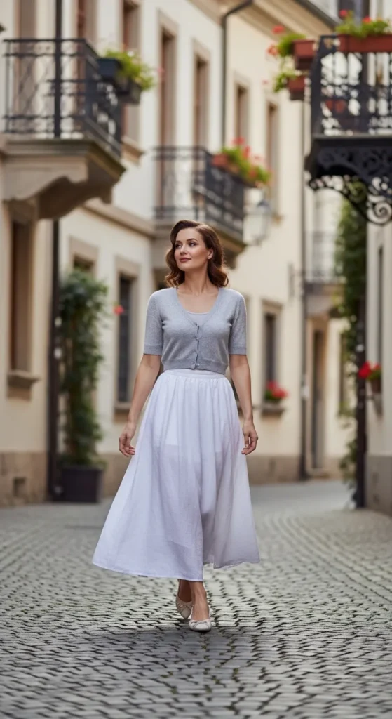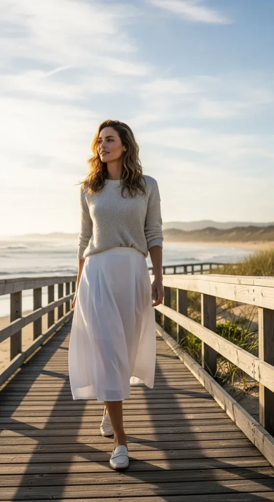 A lightweight sweater with a white skirt is perfect for breezy sunny days. It feels cozy yet fresh, especially when the fabrics stay breathable and soft.