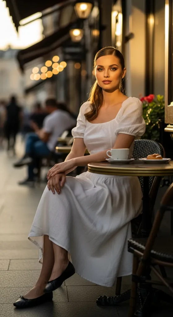 A puff-sleeve top brings playful volume to a white skirt. It feels feminine, current, and perfect for sunny afternoons when you want something special but still comfortable.