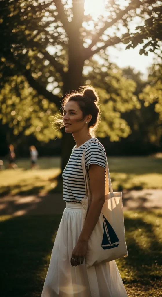 Stripes and white skirts are a forever pairing. The look feels cheerful, easy, and perfect for casual daytime plans when you want effortless charm.