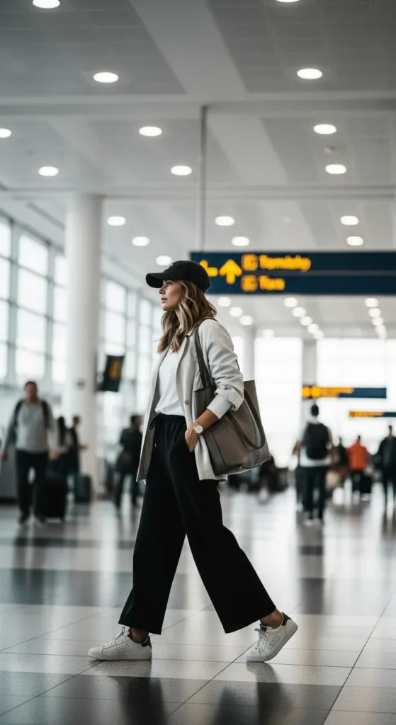 Stylist Suggestion: Add a baseball cap and oversized tote bag. These travel staples make the outfit practical while still looking stylish in airport settings.