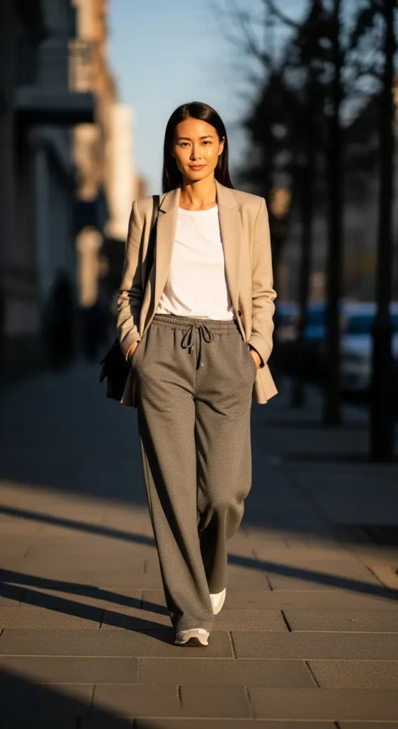 Wide leg sweatpants paired with a fitted tee and a relaxed blazer create a surprising mix of cozy comfort and modern polish.