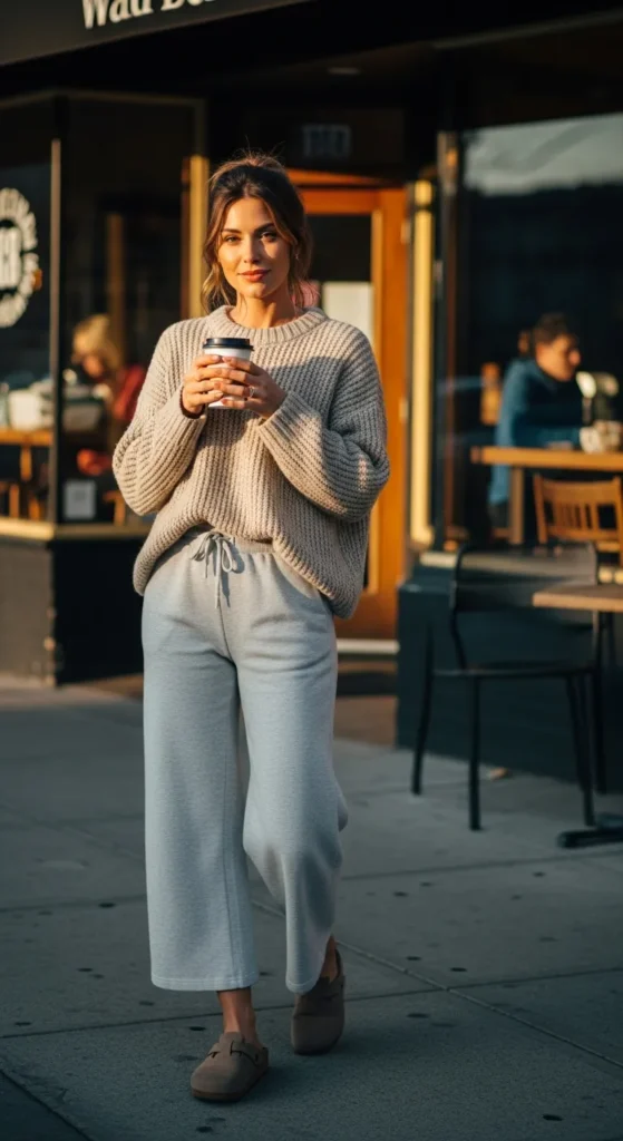 Relaxed wide leg sweatpants styled with a soft oversized knit sweater create the perfect cozy coffee run outfit. The textured knit adds warmth and visual interest to the casual silhouette.