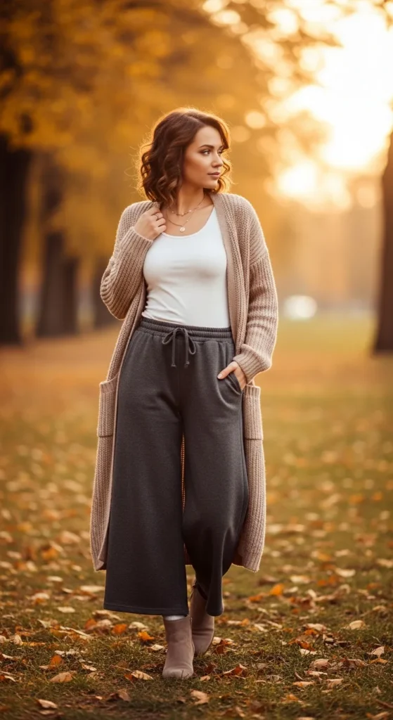 Wide leg sweatpants styled with a fitted tank top and a long cozy cardigan feel relaxed but thoughtfully layered. This outfit is perfect for transitional weather when comfort and warmth both matter.