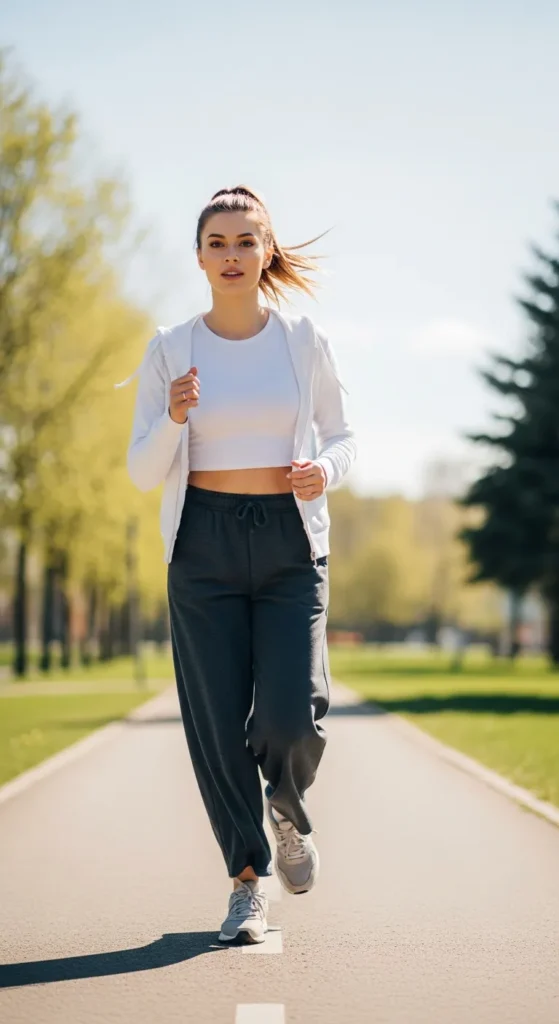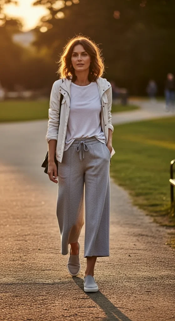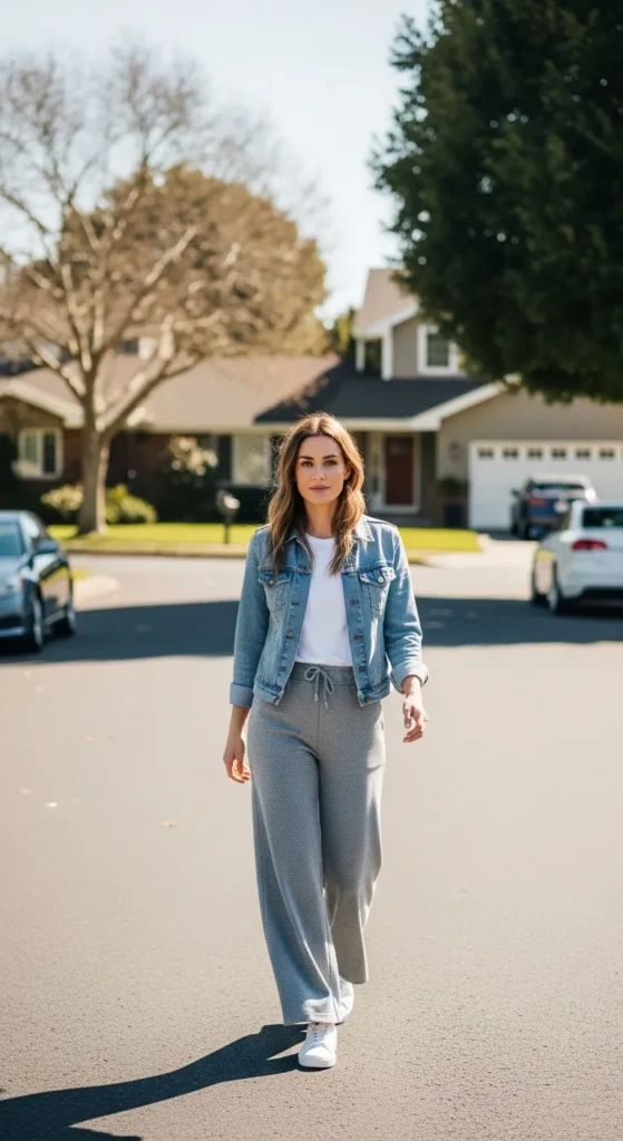 Wide leg sweatpants paired with a relaxed tee and lightweight jacket create an easygoing outfit perfect for evening walks or relaxed outdoor moments.