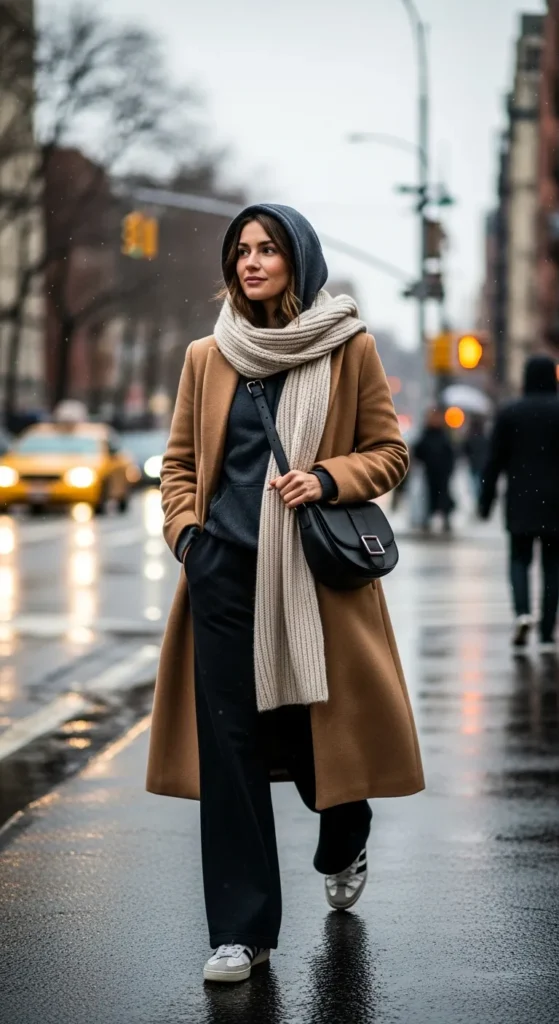 Wide leg sweatpants layered with a hoodie and long coat create a cozy winter outfit that still feels fashionable.