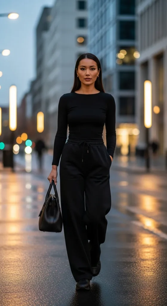 Black wide leg sweatpants paired with a simple black fitted long sleeve top create a sleek monochrome look that feels both cozy and refined. The single color palette makes the outfit feel quietly stylish.