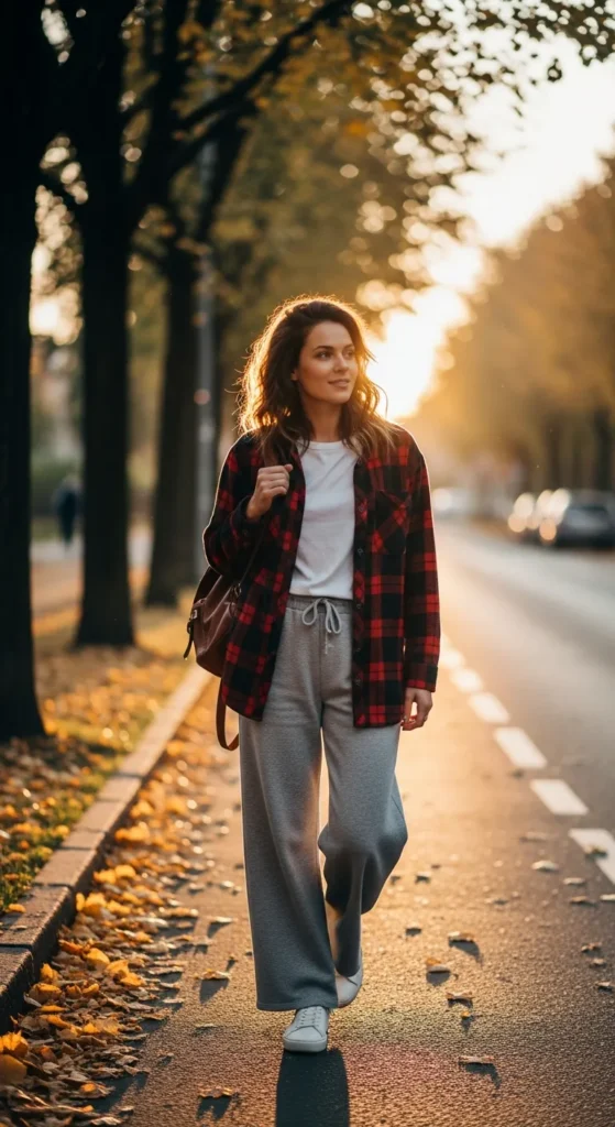 Wide leg sweatpants paired with a basic tee and an oversized flannel shirt bring a cozy laid-back vibe that works perfectly for cooler casual days.