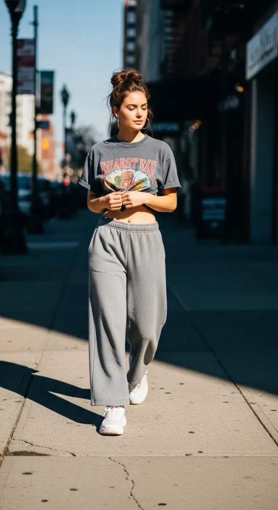 Wide leg sweatpants styled with an oversized vintage graphic tee create a relaxed, effortless street look. The loose fit of both pieces feels carefree while still looking intentionally styled for casual daytime outings.