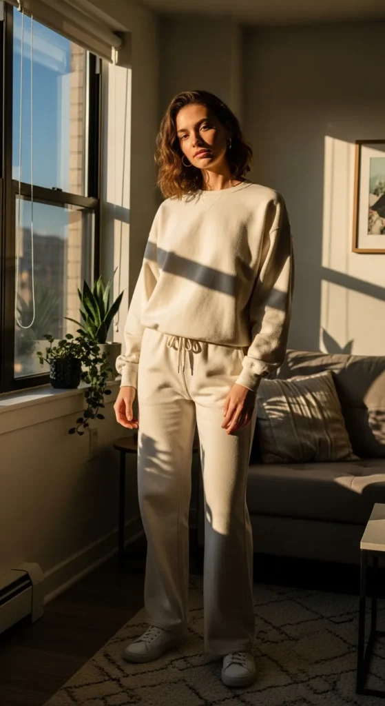 Soft cream wide leg sweatpants paired with a matching relaxed sweatshirt create a calming, cozy outfit that feels effortlessly chic. The neutral tone makes the look feel clean and minimal while still feeling warm and comforting for everyday wear.