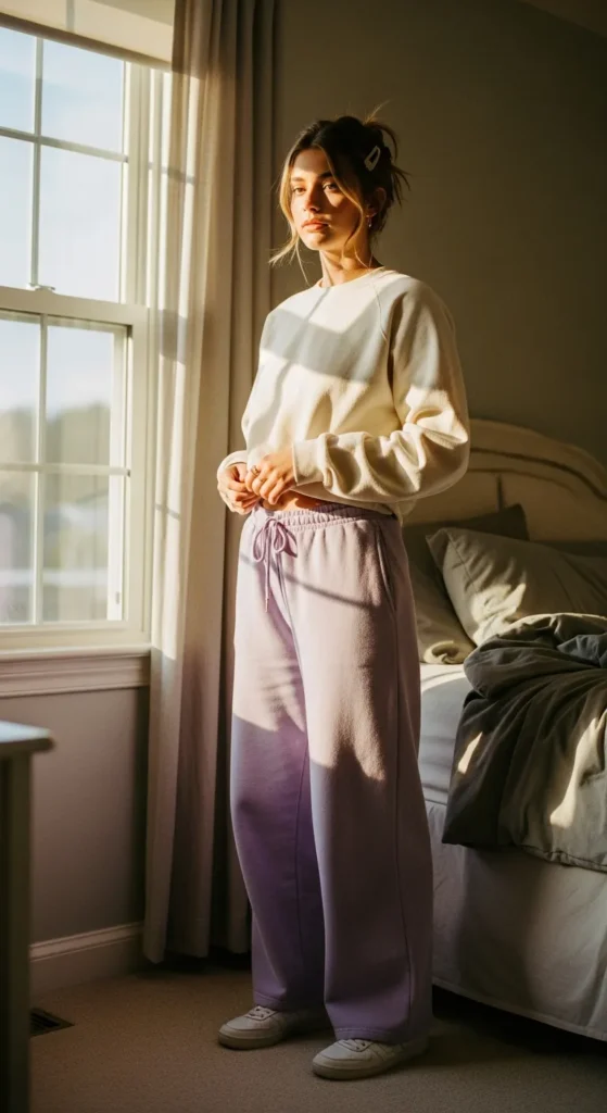 Pastel wide leg sweatpants paired with a soft neutral sweatshirt create a calming and gentle outfit that feels perfect for relaxed days.