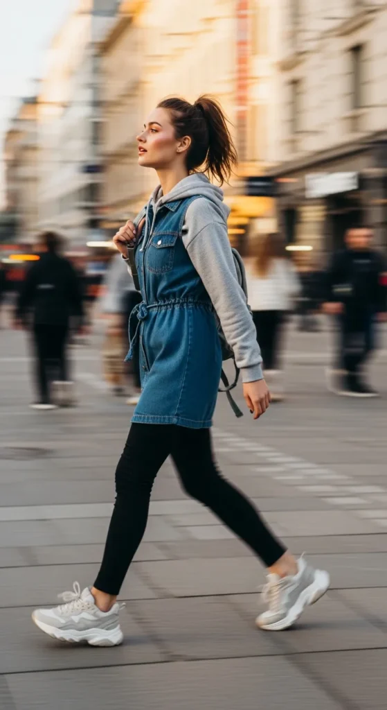 Stylist Suggestion: Let the hoodie hood sit outside the dress neckline. This adds dimension and makes the layering look intentional rather than accidental.