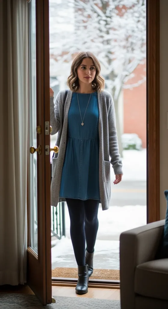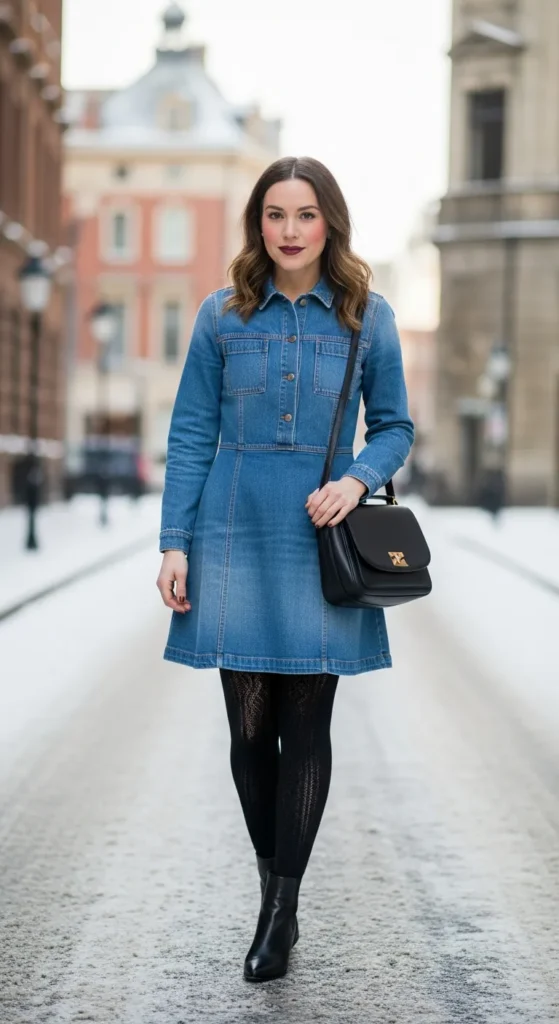 Pairing a denim dress with warm tights completes a winter-ready look. It feels simple yet thoughtful, proving that small details can make an outfit feel fully styled.