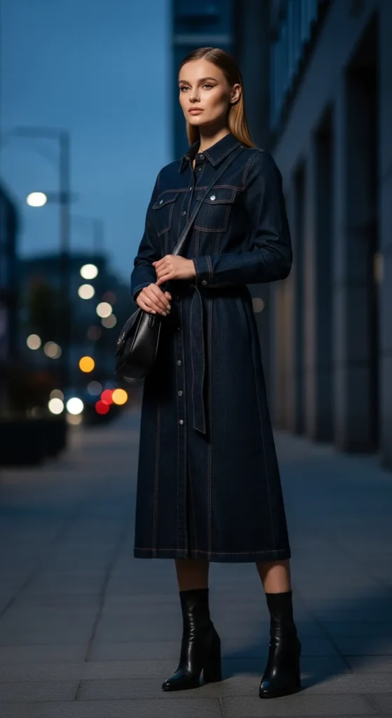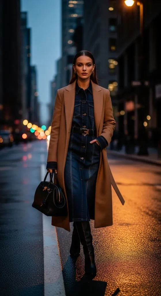 A tailored long coat layered over a denim dress instantly elevates the outfit. It feels powerful and refined while still approachable, making it perfect for winter evenings or city walks.