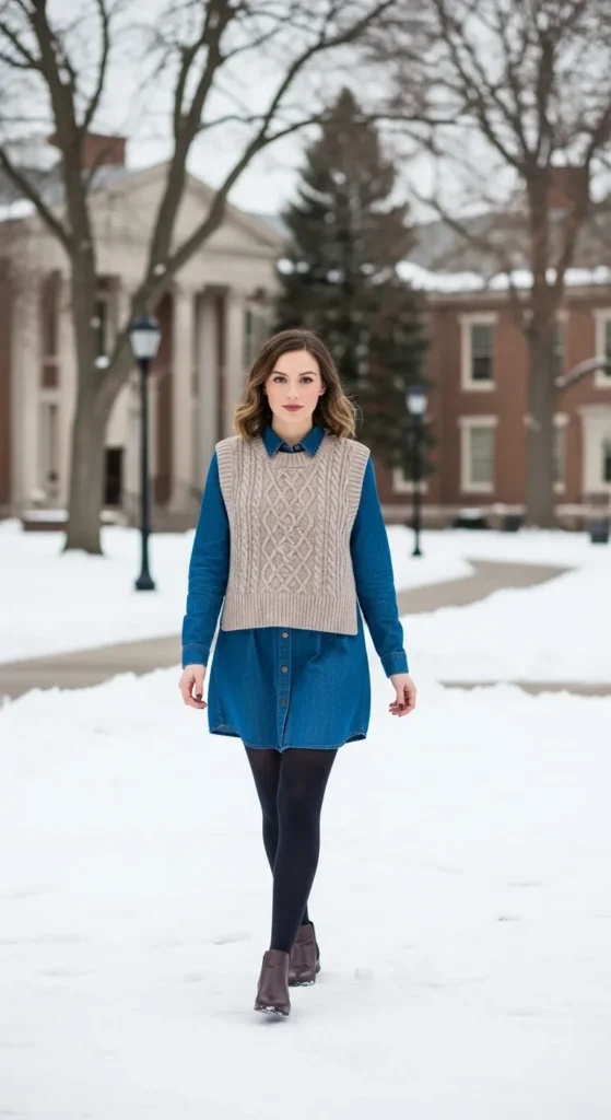 Adding a knit vest over a denim dress creates texture and warmth. The layered look feels youthful, creative, and very wearable for winter days.