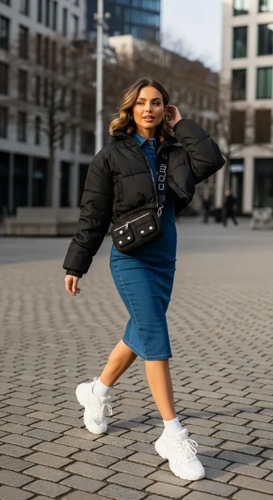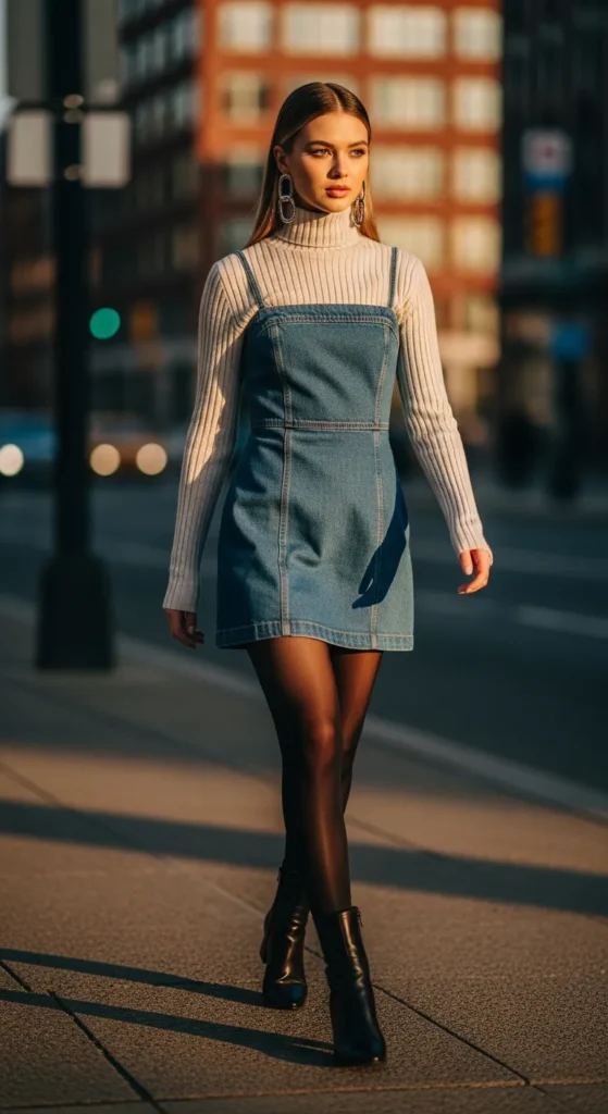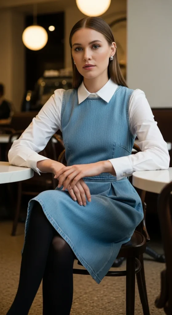 Wearing a crisp shirt under a denim dress adds dimension and personality. This layered approach feels playful yet polished, perfect for those who love experimenting while staying winter-appropriate.