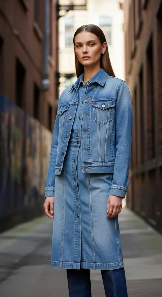 Styling a denim dress with similar-toned layers creates a smooth, monochrome effect. The look feels calm, confident, and very modern.