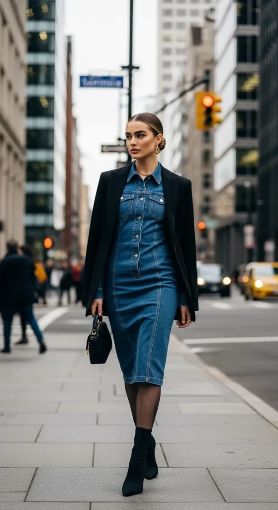 A sharp blazer over a denim dress transforms casual denim into a strong winter statement. This look feels confident, modern, and perfect for city life.