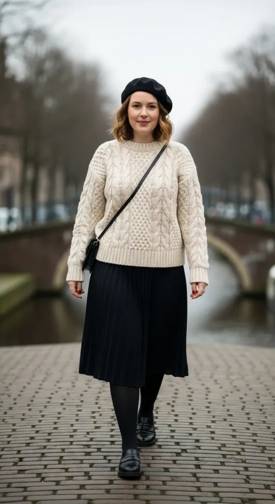 A cable knit sweater adds warmth and charm. The midi skirt moves gently with each step, contrasted with thick tights for insulation—a perfect combination for cold but stylish days.