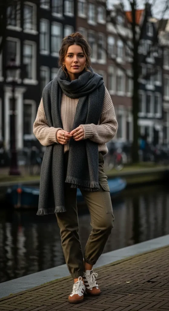 The chunky scarf becomes the center of the look. A knit sweater keeps it cozy, while cargo pants add a laid-back feel—perfect for casual explorations.