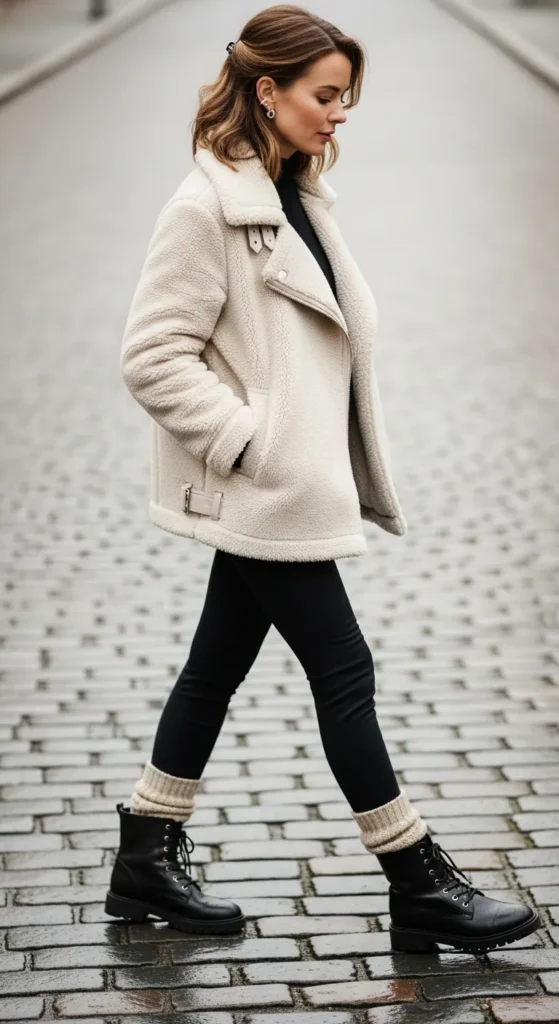 A faux shearling jacket brings instant coziness. Paired with black leggings and visible knit socks, it feels like a warm hug while still looking put-together enough for a day exploring boutiques.