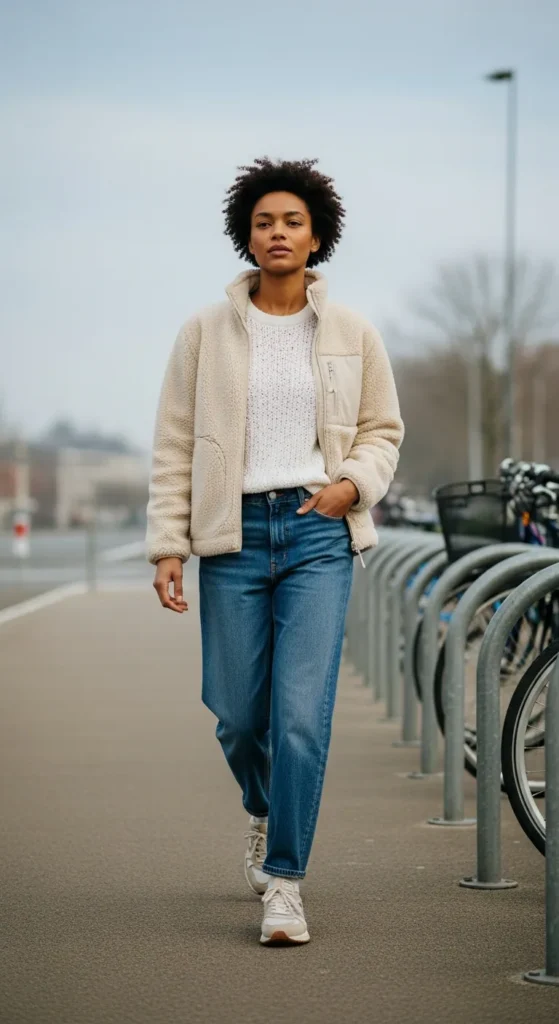 A fleece jacket adds a soft, comforting layer. Paired with a knit top and relaxed jeans, this outfit is perfect for casual winter errands in Amsterdam.