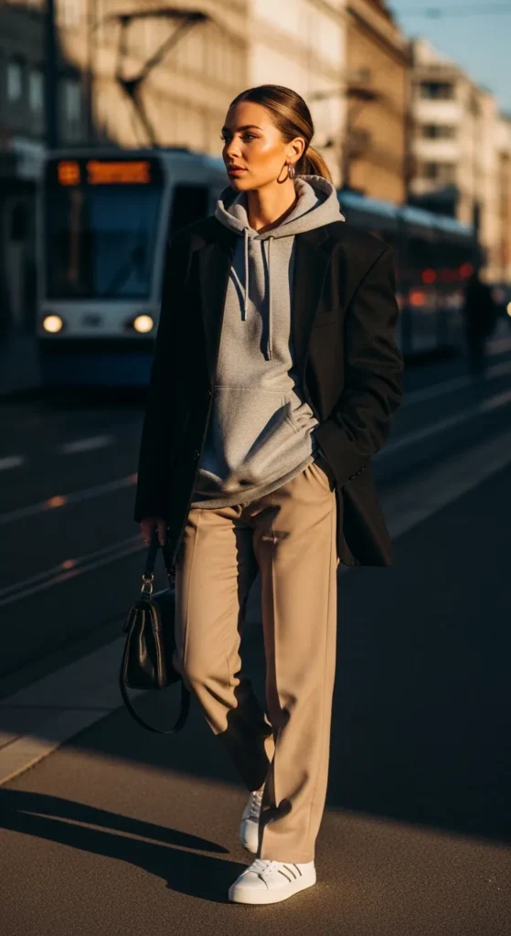 A hoodie layered under a blazer adds street-chic warmth that feels very Amsterdam student-life. Straight pants keep the look structured while still casual.