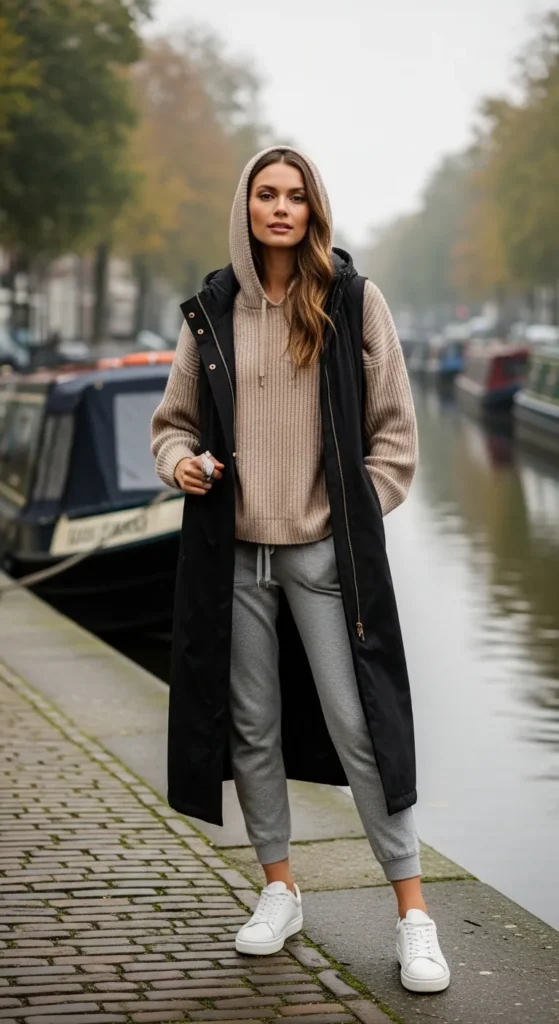A knit hoodie under a warm gilet creates a chic cozy vibe. Jogger pants make it easy, warm, and very Amsterdam for slower winter days.