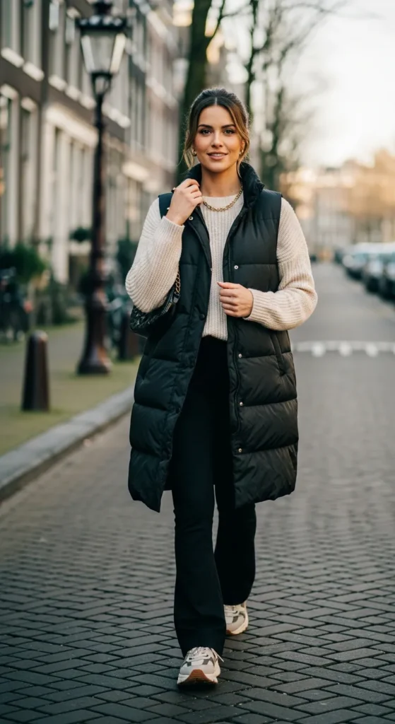 A long puffer vest is perfect for days when a full coat feels too heavy. Paired with a soft sweater and flared leggings, it creates a clean, athletic-inspired winter look.