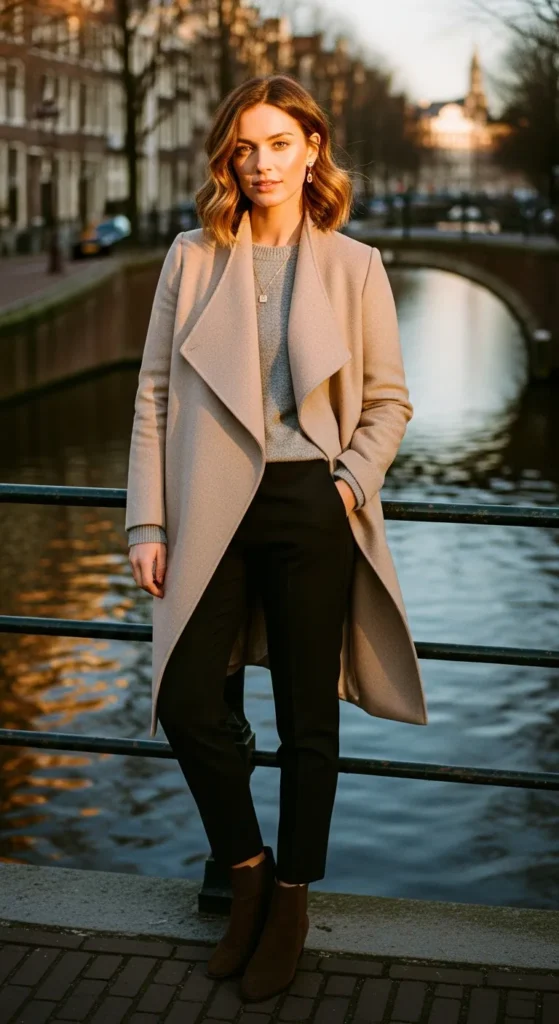A wrap coat adds fluid sophistication. With a cashmere sweater and slim pants, it feels equal parts warm and elegant—ideal for cozy café afternoons.