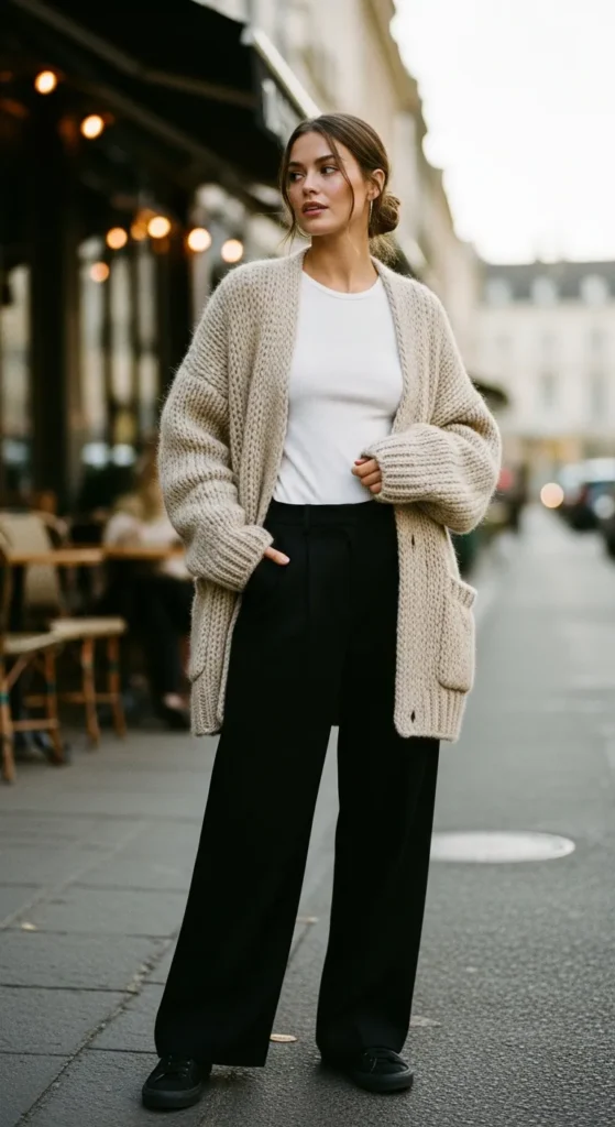 3. Oversized Cardigan + Thermal Top + Wide-Leg Trousers