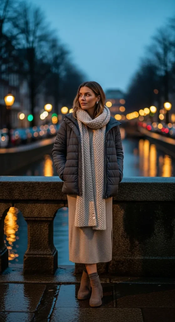 A knee-length knit dress under a warm puffer jacket creates that relaxed Amsterdam mix of cozy and functional. A chunky scarf makes it feel personal, like something you reach for every morning without thinking.