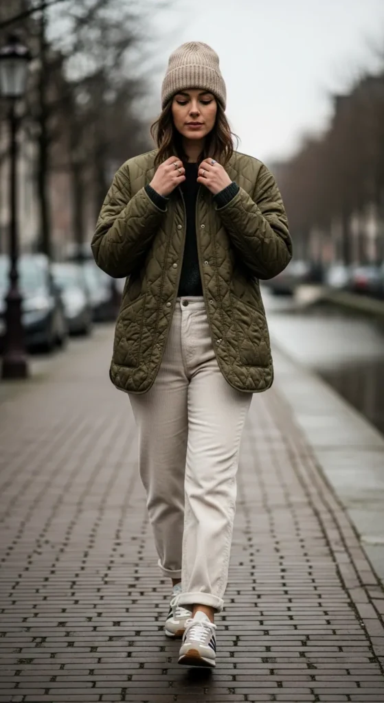 The quilted jacket is practical yet charming—especially in Amsterdam’s chilly winds. Corduroy pants add vintage warmth, while a beanie feels both necessary and stylish.