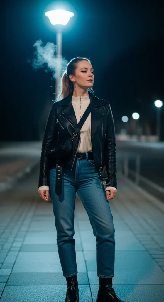 A ribbed mock neck adds texture, while a leather jacket brings urban edge. Straight jeans keep everything wearable and unfussy.