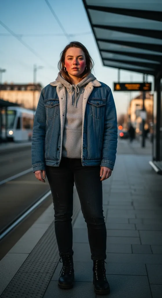 Sherpa-lined denim brings that warm, nostalgic winter energy. Layered over a hoodie, it feels relaxed and youthful. Black jeans keep it grounded and sleek.